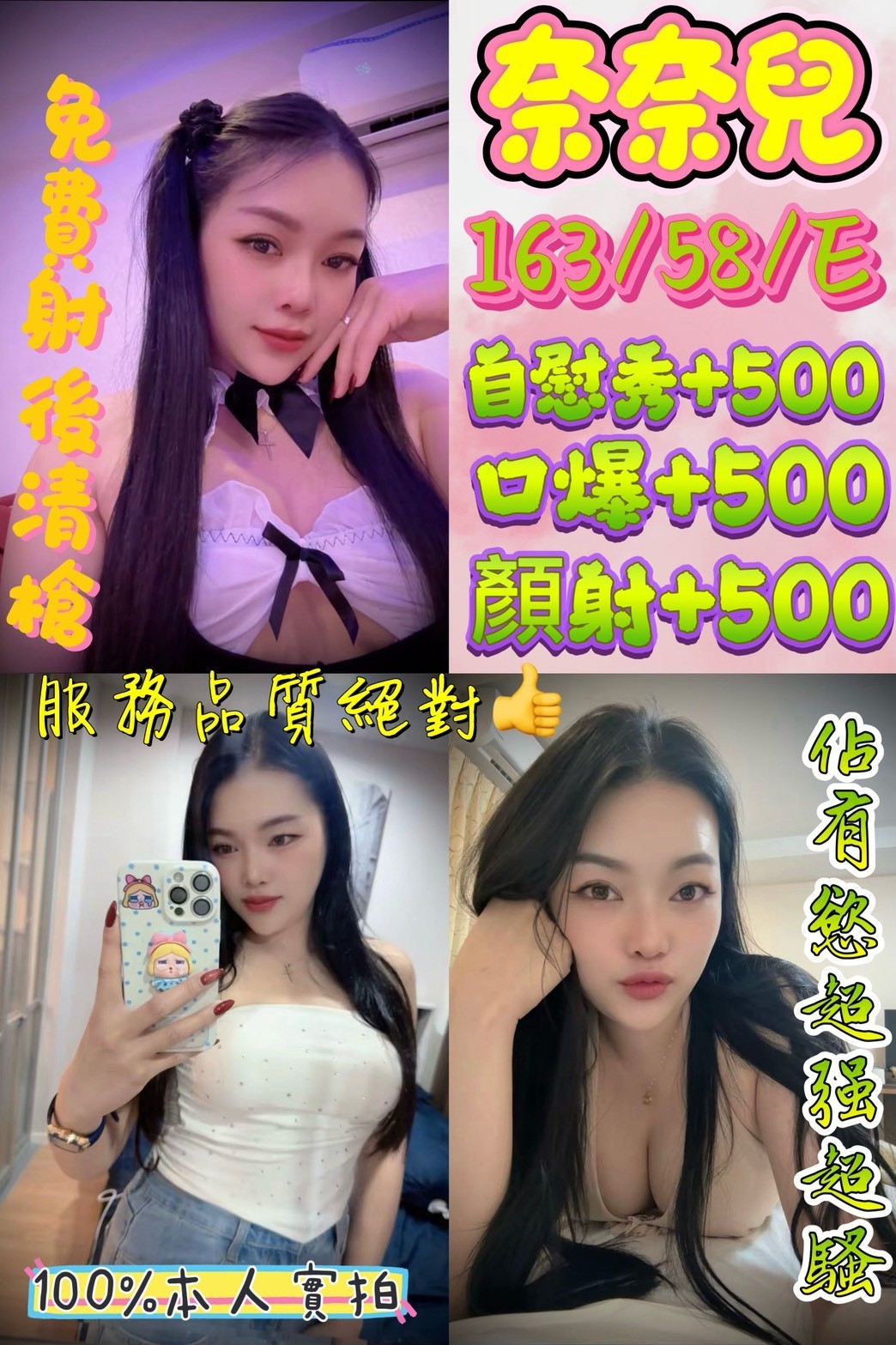 無套吹/共浴殘廢澡/親密KISS.舌吻(視個人衛生和妹妹現場感覺.自行開發)/共浴/六九/胸推/屁推/奶泡/按摩/品鮑/舔蛋/免費射後清槍